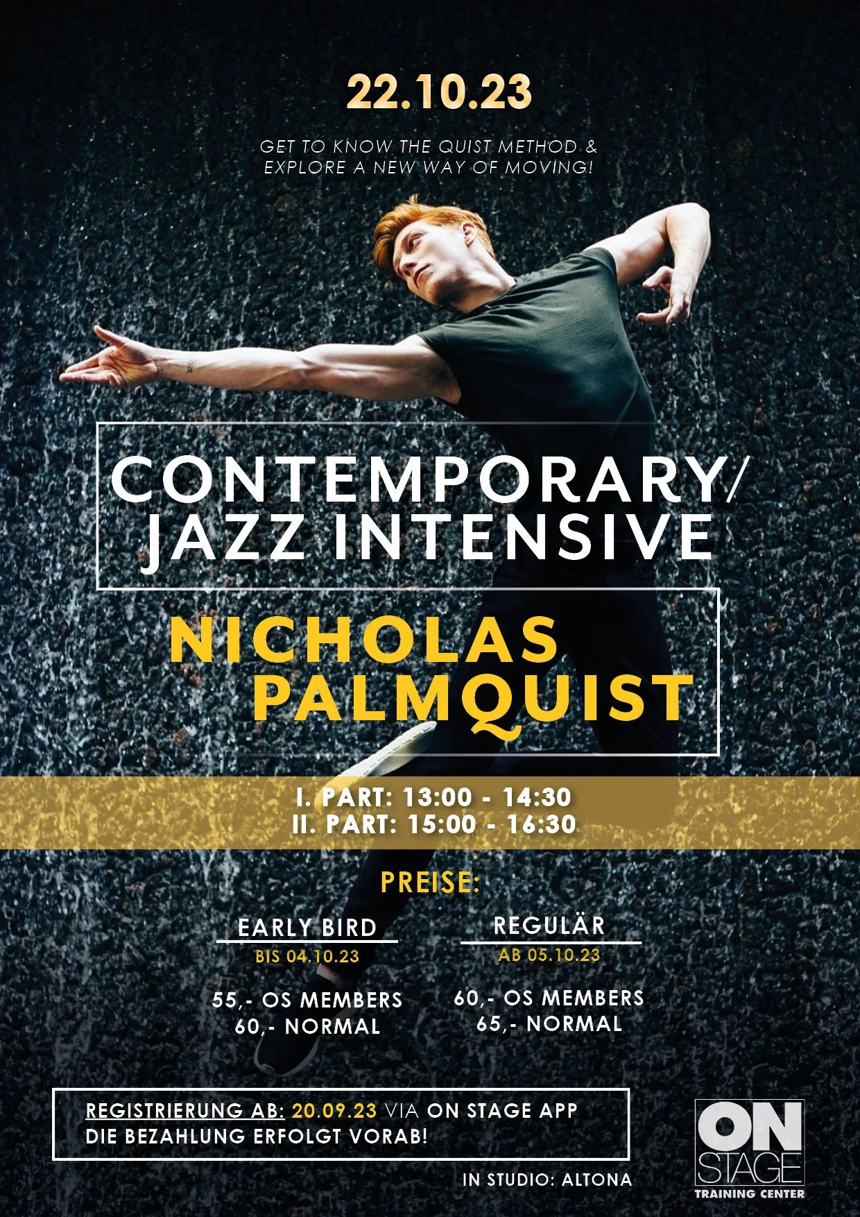 Throughout the workshop, Palmquist will teach excerpts of his repertoire from various professional work as well as new and exploratory movements. His experiences in TV, film, fashion, theater and contemporary ballet provide a variety of perspectives and movement influences, with his choreography becoming a talking point for style, musicality and storytelling.